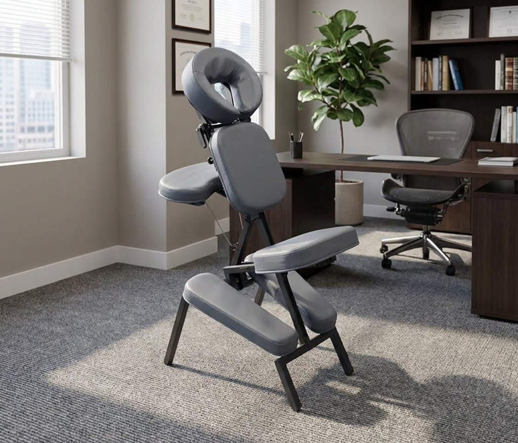 You walk into a corporate office, a gym or a client’s living room. The chair comes out of the bag, unfolds as one piece and locks into position. No buttons to press, no parts to attach, no awkward assembly while your client watches.